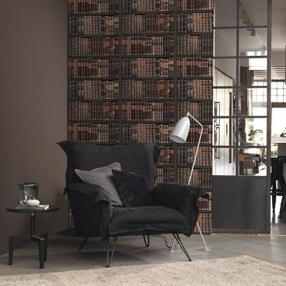 Papel de parede lavável, textura vinílica imitando a estantes de livros com cor predominante marrom escuro, pouco colorido.