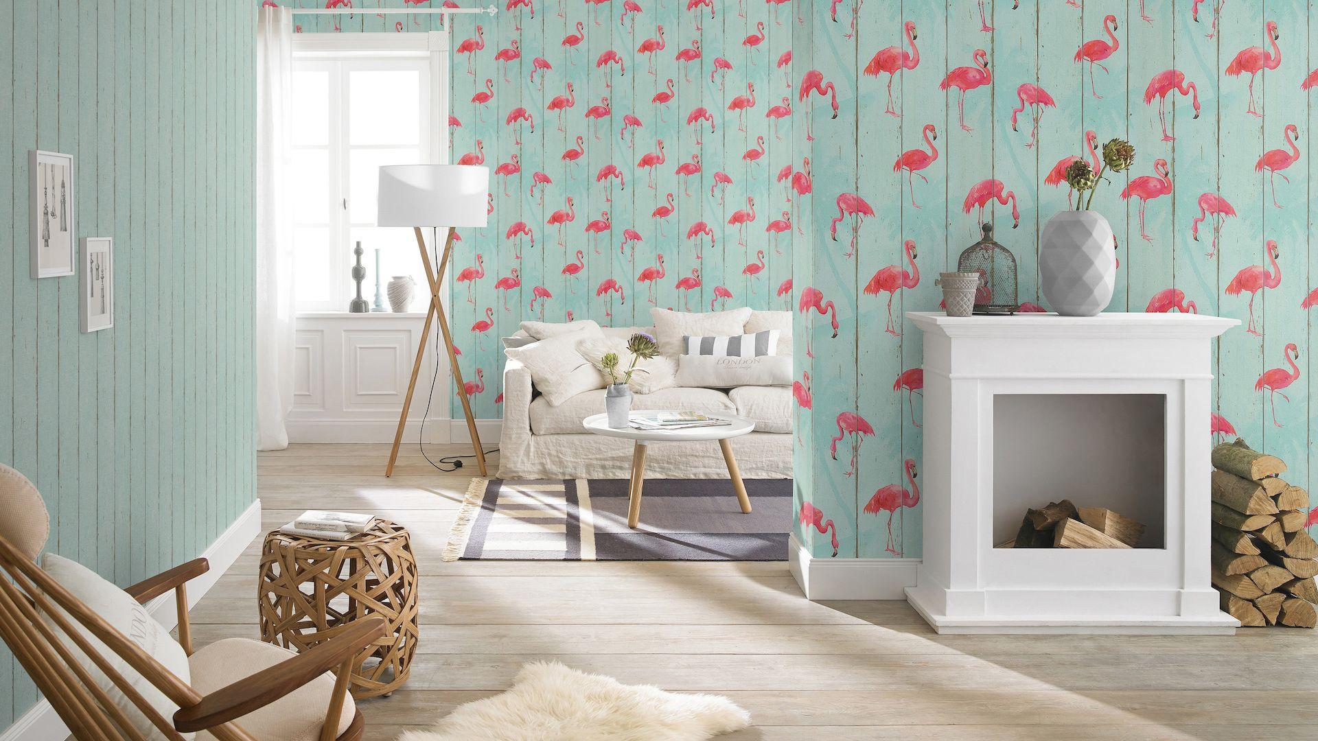 Papel de parede lavável, textura vinílica, com imagens de flamingos em tom de rosa chiclete, cor de fundo verde água que simulam aparência de madeira.
